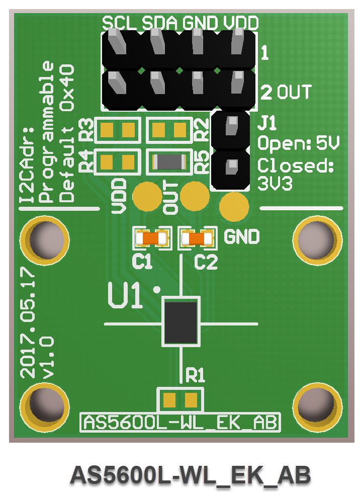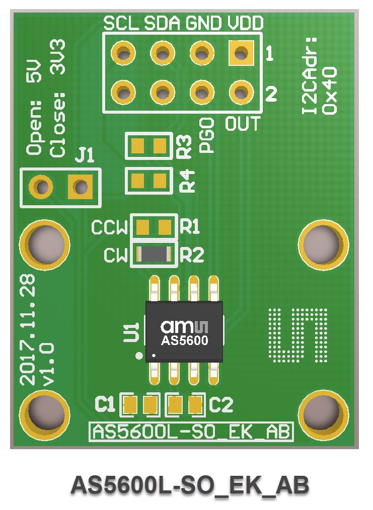 ams OSRAM AS5600L Adapter Boards are the small PCBs that evaluate the AS5600L magnetic position sensors. These PCBs can be connected to an external microcontroller or the USB I&P box. Both AS5600L-WL_EK_AB and AS5600L-SO_EK_AB are specifically designed to evaluate the AS5600L magnetic position sensors.AS5600L Adapter Board Components