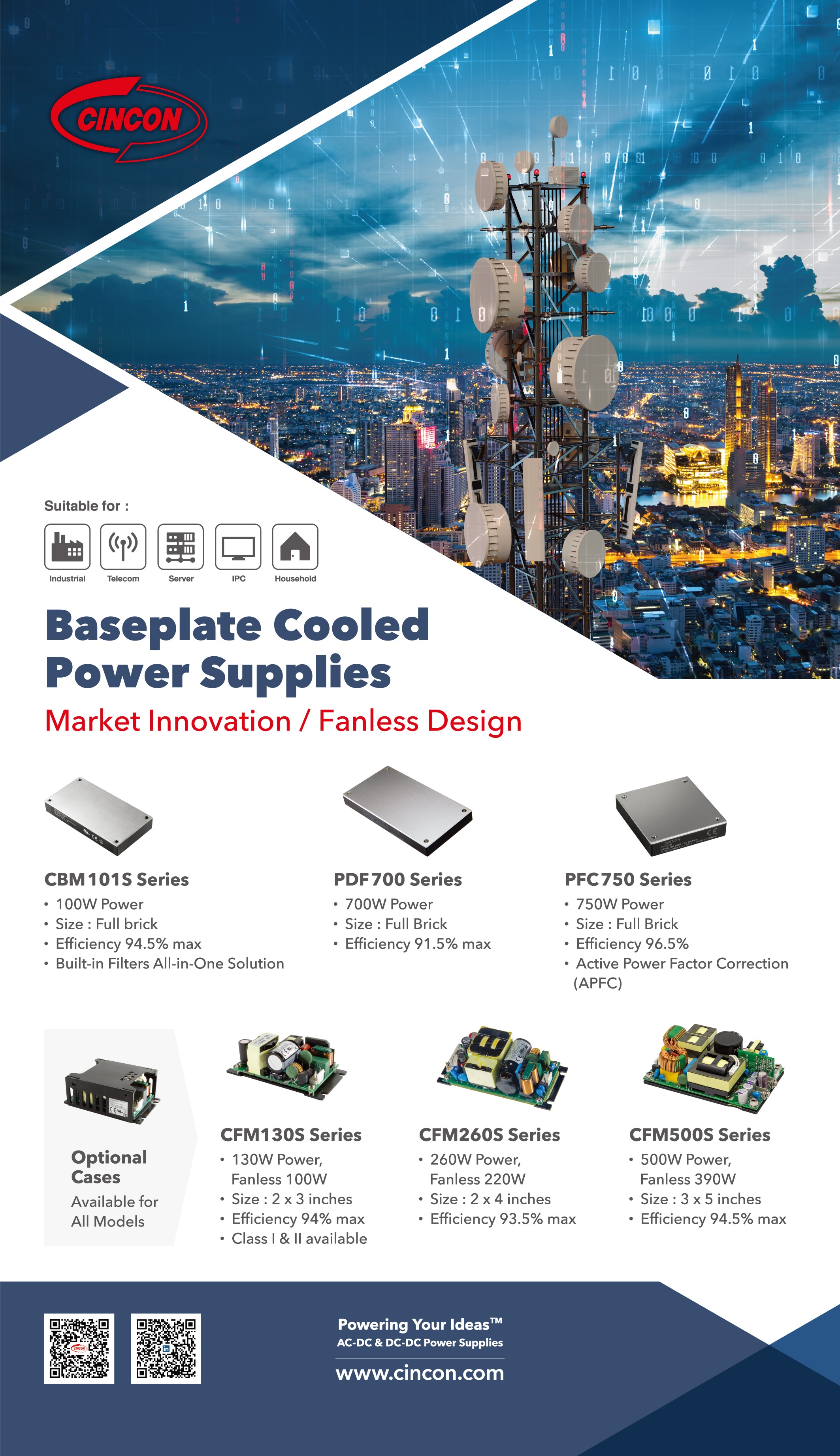 Cincon offers a comprehensive range of AC-DC power solutions, including baseplate cooling power supplies and AC-DC brick-type power supplies. The baseplate-cooling power supplies feature a power range from 130W to 500W, while the AC-DC brick-type power supplies range from 70W to 750W. Cincon also offers detailed technical articles explaining the exceptional performance of their fanless power supplies. These power solutions are suitable for various applications, such as industrial and ITE use with IEC/UL/EN 62368-1 safety approvals, as well as medical use with IEC/UL/EN 60601-1 safety approvals.Features